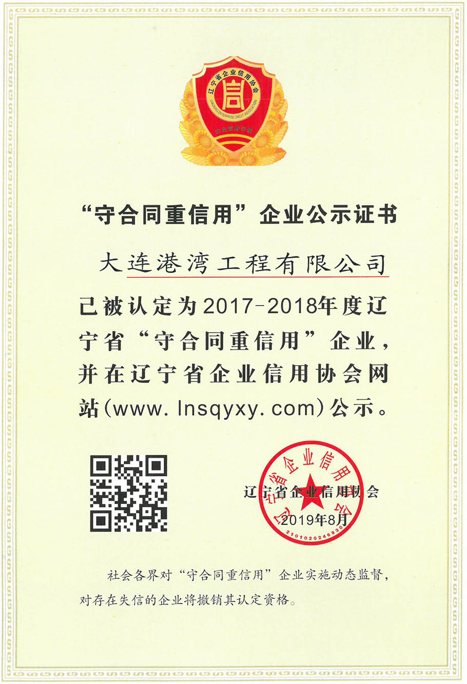 2017-2018年度辽宁省“守合同重信用”企业证书